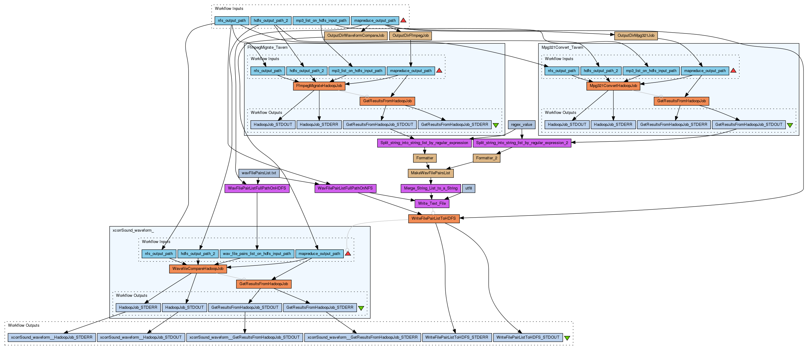 To sum up what this workflow does, is migration, conversion and content comparison. The top left box (nested workflow) migrates a list of mp3s to wav files using a Hadoop map-reduce job using the command line tool Ffmpeg, and outputs a list of migrated wav files. The top right box converts the same list of mp3s to wav files using another Hadoop map-reduce job using the command line tool mpg321, and outputs a list of converted wav files. The Taverna work flow then puts the two lists of wav files together and the bottom box receives a list of pairs of wav files to compare. The bottom box compares the content of the paired files using a Hadoop map-reduce job using the xcorrSound waveform-compare commandline tool, and outputs the results of the comparisons.